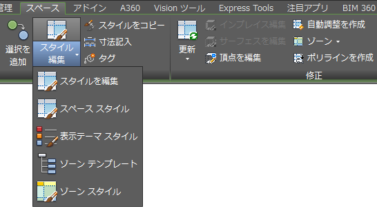 選択したオブジェクトに応じて、そのオブジェクトのスタイルだけでなく、サポート オブジェクトとして機能するオブジェクトのスタイルにもアクセスできます。たとえば、スペースを選択した場合、スペース スタイル、ゾーン スタイル、ゾーン テンプレート、表示テーマ スタイルにアクセスできます。