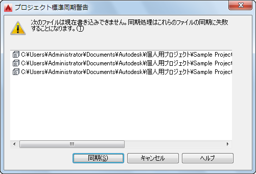 次のような警告メッセージを受け取った場合は、すべてのプロジェクト図面が使用できるようになるまで待つか、含めることができない図面があることを了承して、直ちにプロジェクトを同期できます。
