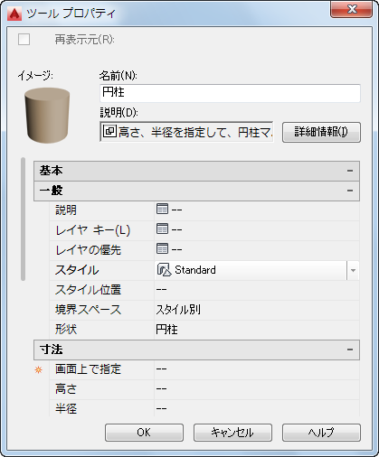 マス要素スタイル ツールのツール プロパティ。ツールの名前が、より内容が分かりやすいように変更された点に注目してください。また、このツールが作成するマス要素は、外壁に分類される装飾用柱を定義するように設計されているため、ツールの作成者は、現在のレイヤ キー スタイル中の "WALL" キーで定義されるレイヤ上にマス要素を配置するようにしています。この例では、マス要素の形状は円柱として事前に定義されていますが、これも、特定のマテリアル割り当てだけではなく、特定のオブジェクト タイプを定義するように設計されているためです。