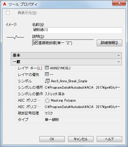 - 破断線ツールでは、破断線記号と同じ図面に支援要素を含めます。集計タグなどの他のマルチコンポーネント ツールと同様に、将来の変更が容易になります。破断記号がオブジェクトをマスクするかトリムするかを含め、破断記号のプロパティは、すべてツール プロパティ内で設定します。