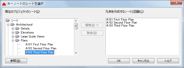 | 他のシートからのものも含めてすべてのキーノートを含める | 右クリックして[シート]をクリックし、[キーノート凡例を作成するシートを選択]ダイアログ ボックスを表示します。左側のペインに、現在のプロジェクトのシートが一覧で表示されます。必要に応じてシートを選択し、[追加]をクリックして右側のペインに移動します。さらに[参照]をクリックして、シートとして保存されている他のプロジェクトまたは図面のシートを取得します。右側のペインに、含めるキーノートを持つすべての図面/シートが表示されたら、[OK]をクリックします。 |