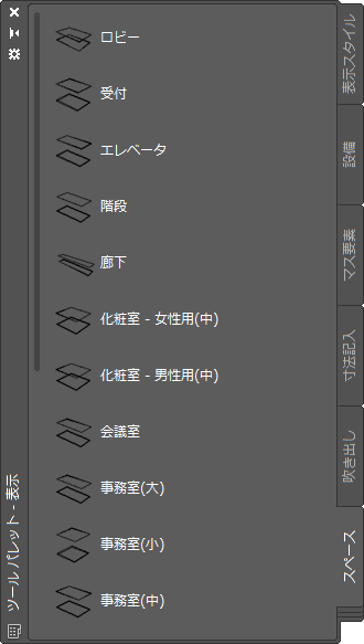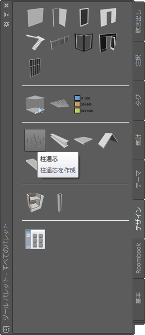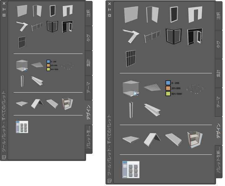 ツール パレット セットの表示は、ツール パレット セット全体に対して指定した設定と個々のツール パレットごとに指定した設定によって決まります。ツール パレット セットで、ツール パレット セットの透過性、サイズ、位置、自動非表示を指定します。