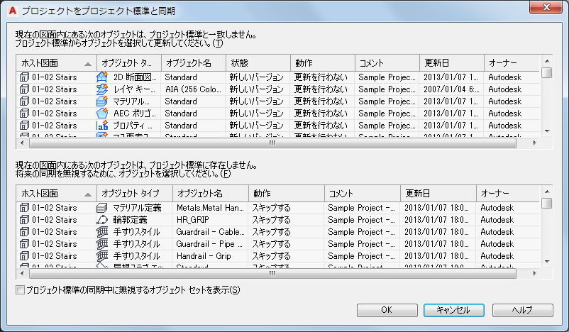 プロジェクトや図面を AEC プロジェクト標準仕様に同期させると、プロジェクト図面のそのスタイルや表示設定は、標準図面のバージョンに比較されます。プロジェクト図面のスタイルや表示設定のバージョンが、標準図面のバージョンと同じでない場合は、スタイルや表示設定に関するいくつかの可能な動作から選択できます。