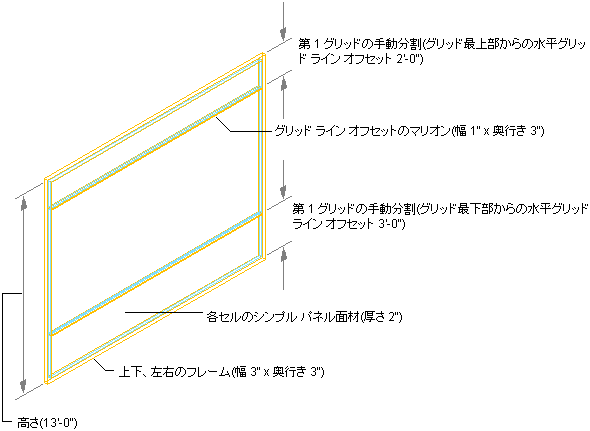 カーテン ウォールのように、カーテン ウォール ユニットは、1 つまたは複数のグリッドから成ります。それぞれのグリッドには水平分割または垂直分割がありますが、グリッドをネストすることにより各種のパターンを作成することができます。