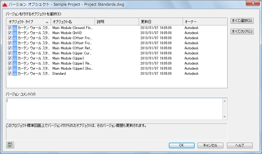 コメントは、バージョン付けに選択したすべてのオブジェクトに適用されます。