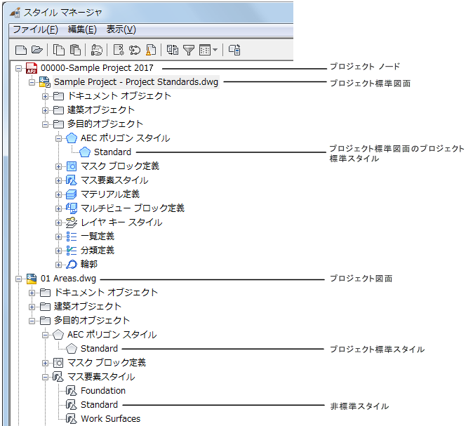 プロジェクト ノードの下の標準図面および標準スタイル