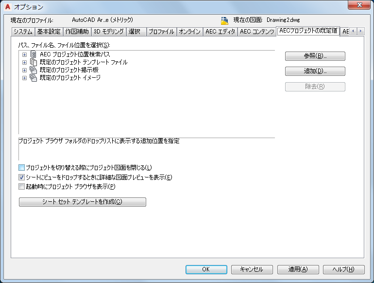 現在の図面に既定の AEC プロジェクトの既定値オプションを指定する