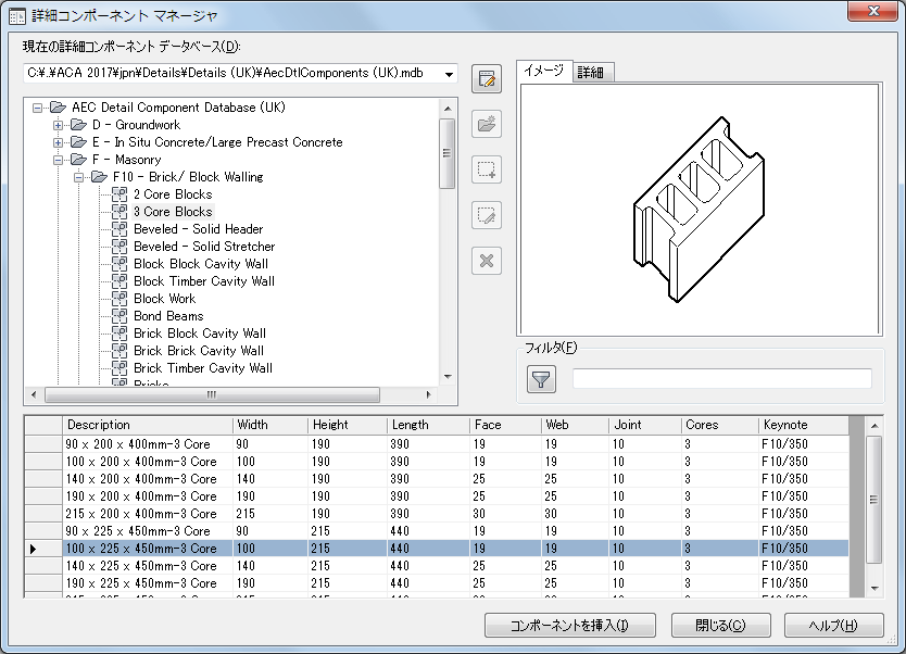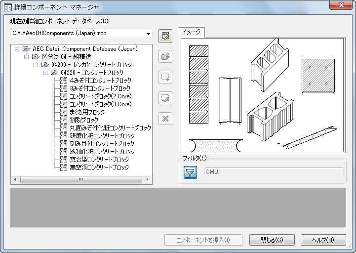 コンクリート組積造の表が表示された[詳細コンポーネント マネージャ]ダイアログ ボックス