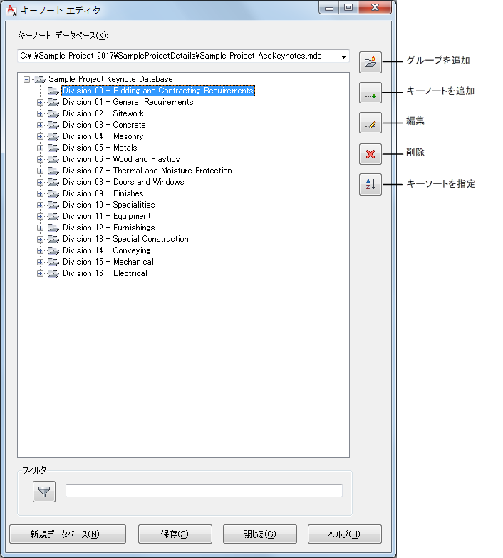 キーノート エディタは、キーノート データベースの作成と変更ができるスタンドアロン アプリケーションです。[CAD マネージャ]メニューからアクセスした[キーノート エディタ]ダイアログ ボックスには、現在選択しているデータベースをルートノードとして表示する階層ツリー ビューが表示されます。既存のデータベースの場合には、ルートノードを展開してグループを表示し、グループを展開してサブグループ、または個々のキーノートを表示します。または、ツリー ビューの下にある[フィルタ]ボックスに、テキストを入力することもできます。[フィルタ]ボタンをクリックして、[Tab]キーを押すか、[Enter]を押して、入力した名前を含む任意のノードの下位にあるすべてのノードを展開します。
