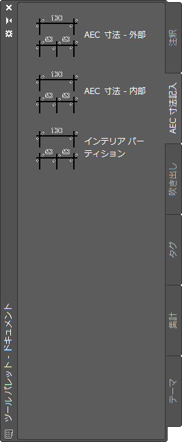 CAD マネージャや他のユーザにより作成されたカスタム パレットには、プロジェクトやオフィス標準に合わせてカスタマイズされた AEC 寸法スタイルおよびプロパティを含む AEC 寸法ツールが存在する場合もあります。