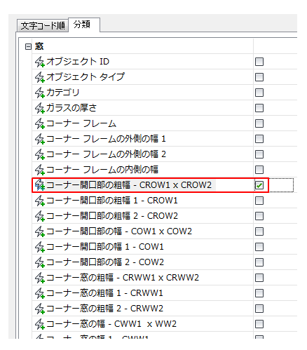 生成された集計に、自動プロパティの[コーナー開口部の粗幅 - CROW1 x CROW2]が表示されます。