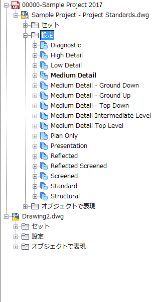 標準表示設定は、プロジェクトに割り当てられる標準図面に編成されます。表示設定のグループがプロジェクトの標準設定として定義され、プロジェクト図面に導入されると、それらは標準仕様とリンクされ、標準仕様で同期化されます。同じリンクでは、プロジェクト図面の表示設定は、標準表示設定を更新することもできます。