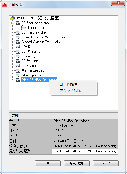 コンテキスト メニューから、アタッチされている外部参照のロード解除、再ロード、アタッチ解除を行うことができます。