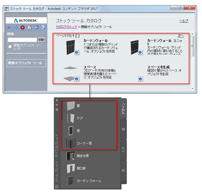 [コンテンツ ブラウザ]内のカタログのツールを AutoCAD Architecture 内のツール パレットにリンクするには、次の手順を実行します。
