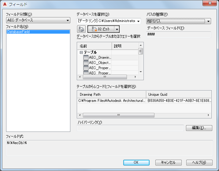 図面に挿入するデータベース フィールドを選択するには、次の手順を実行します。