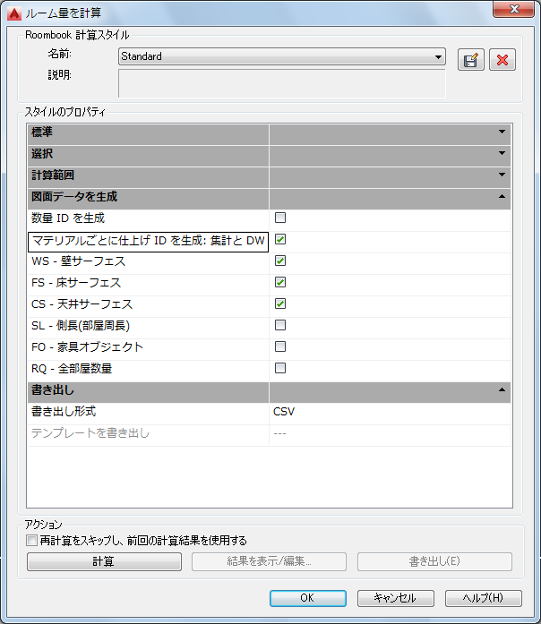 - [ルーム量を計算]ダイアログ ボックスで、[スタイルのプロパティ]領域の[図面データを生成]リストから、[マテリアルごとに仕上げ ID を生成]を選択します。