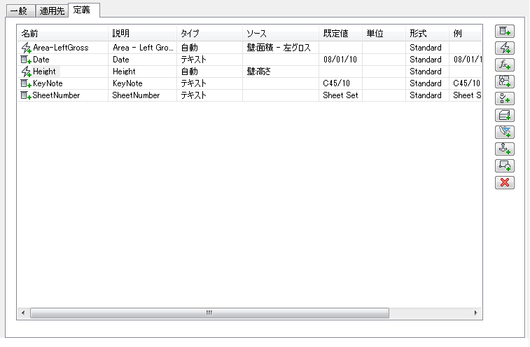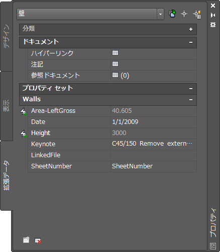 キーノート、日付、およびシート番号フィールドを備えた壁プロパティ