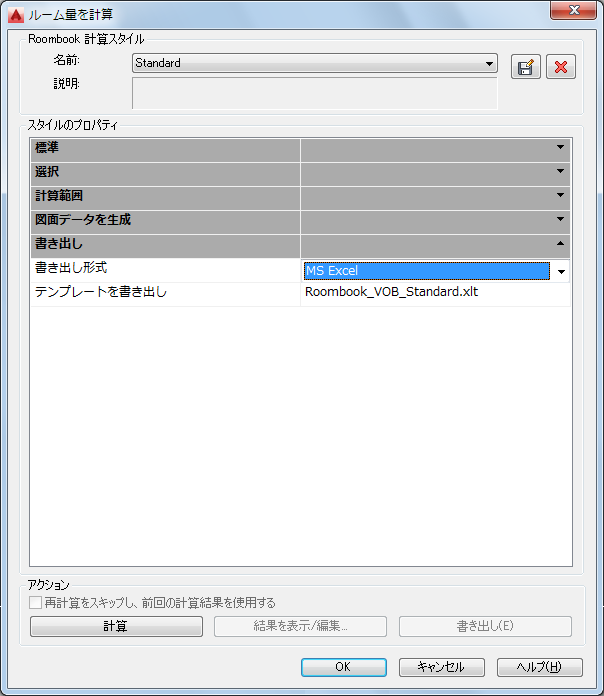 - [ルーム量を計算]ダイアログ ボックスで、[スタイルのプロパティ]領域の[書き出し]リストの[書き出し形式]リストから、[MS Excel]を選択します。