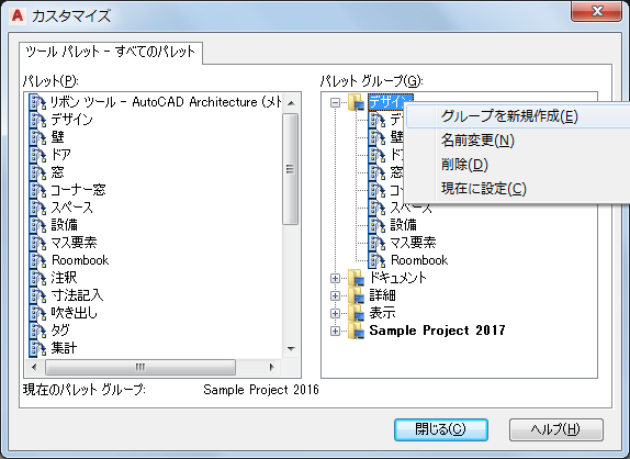 ヒント: [カスタマイズ]ダイアログ ボックスは、パレットをプロジェクトのパレット グループに追加するのにとても便利です。