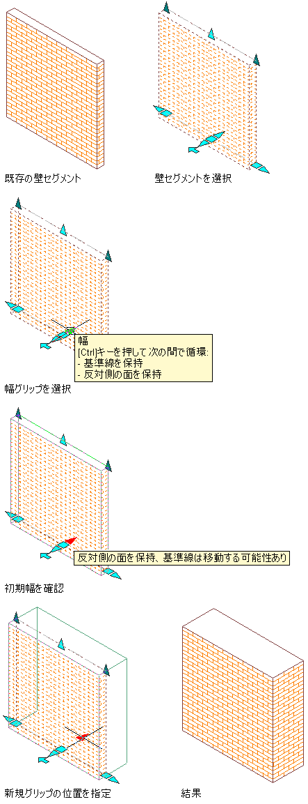 壁の反対側の面を保持したままグリップを使用して壁の幅を変更するには