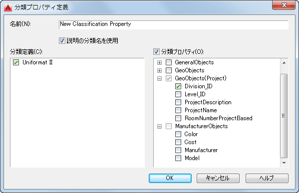 [分類プロパティ定義]ダイアログ ボックスが表示されます。 左側のペインには、現在のプロパティ セット定義のオブジェクト スタイルに適用される分類定義が一覧表示されます。 たとえば、現在のプロパティ セット定義がドア スタイルに適用される場合、[分類]ペインには、ドア スタイルに適用されるすべての分類定義が一覧表示されます。