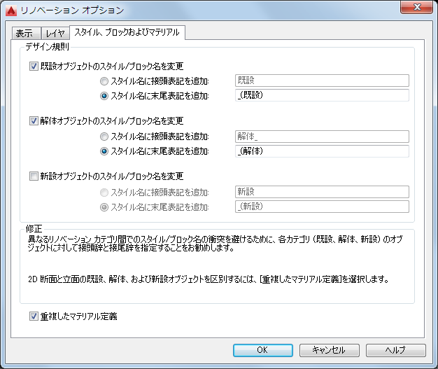オブジェクトのリノベーション カテゴリに基づいて、スタイル名とブロック名に接頭辞または接尾辞を自動的に追加するには、リノベーション デザイン規則を修正します。接頭辞や接尾辞を事前に定義せずに、同じスタイル名またはブロック名が、図面内の別のカテゴリに存在する場合は、警告が表示され、新しい名前を手動で入力できます。