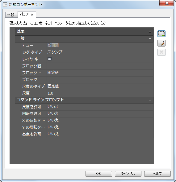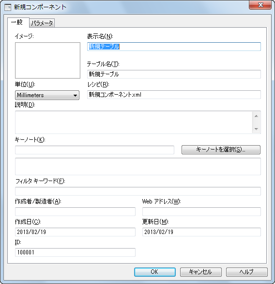 詳細コンポーネント データベースへコンポーネントを追加して、コンポーネントを収容するためのサイズの行が追加できる空のサイズ テーブルを作成するには、次の手順を実行します。コンポーネントを追加するときに[新規コンポーネント]ダイアログ ボックスの[一般]タブと[パラメータ]タブで指定する値は、異なるビューでコンポーネントを描画するための 1 つまたは複数のレシピを作成するために使われます。各レシピには、コンポーネントをビューに配置するための、ジグまたは描画ルーチンの種類が指定されています。レシピには、レイヤとハッチング パターンに関する情報も含まれていることがあります。