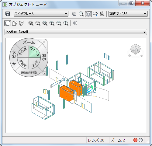 SteeringWheels は、ウェッジと呼ばれる各種のセクションに分割されたトラッキング メニューです。ホイール上の各ウェッジは、単一のナビゲーション ツールを表します。モデルの現在のビューを、さまざまな方法で画面移動、ズーム、または操作することができます。
