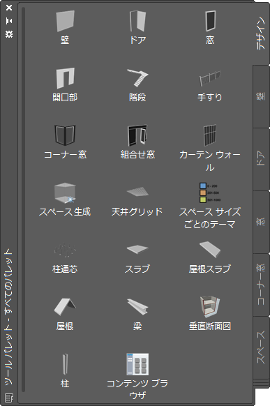 | オブジェクト ツール | オブジェクト ツールは、壁や組合せ窓などの設計オブジェクトを図面内に挿入します。オブジェクト ツールは特定のスタイルと特定のオブジェクト プロパティを持ちます。たとえば、壁ツールは、レンガ-4 レンガ-4 と呼ばれます。 |