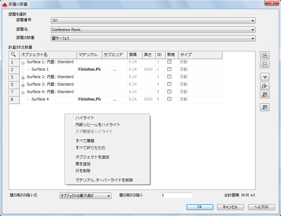 - 計算された各ルーム量(壁サーフェス、床サーフェス、天井サーフェス)の参照ボタンをクリックし、