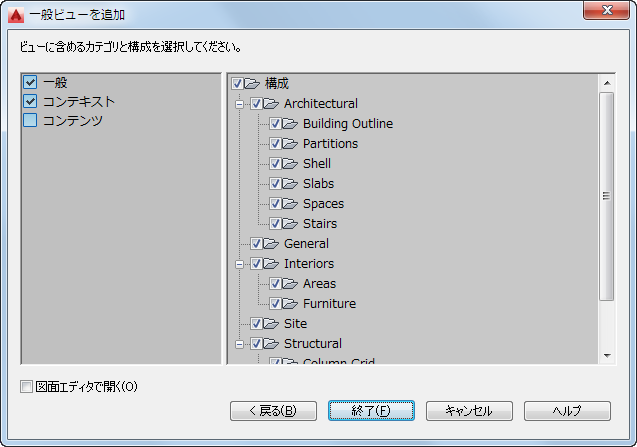 ビュー図面から特定のカテゴリを削除するには カテゴリのチェック ボックスを選択解除します。カテゴリ内の構成がすべて自動的に選択解除されます。