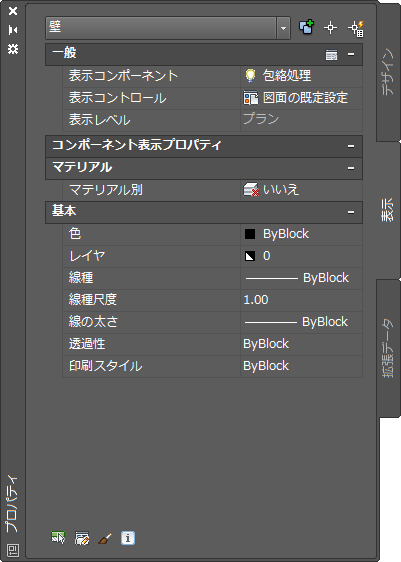 プロパティ パレットの[デザイン]タブでオブジェクトの物理プロパティをコントロールできるように、[表示]タブではオブジェクトの視覚的なプロパティを、境界やハッチなど個々の表示コンポーネントの設定を調整することで、コントロールできます。このタブでの変更内容は、すぐに[プラン]や[モデル]など現在有効な表示レベルで見えるようになり、変更内容を他の表示レベルにも適用することもできます。また、[デザイン]タブの設定は現在選択しているオブジェクトだけに適用されますが、[表示]タブ プロパティに対して行う変更を、そのタイプのすべてのオブジェクトに対して選択したコンポーネントに適用するか、そのスタイルのすべてのオブジェクトに適用するか、または選択したオブジェクトだけに適用するかを指定できます。表示コンポーネントがマテリアルによってコントロールされる場合、変更内容はそのマテリアルを使用するすべてのオブジェクトに適用されます。