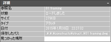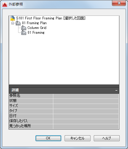- [外部参照]ダイアログ ボックスで、外部参照の詳細を表示します。