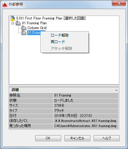 コンテキスト メニューから、アタッチされている外部参照のロード解除、再ロード、アタッチ解除を行うことができます。