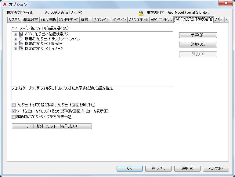 AutoCAD Architecture プロジェクトで既定のオプションを設定するには、次の操作を実行します。プロジェクトには次のオプションを指定できます。