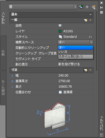 注: AutoCAD、Civil 3D、Land Desktop などの AutoCAD Architecture Object Enabler 環境で図面を開いたり、AutoCAD Architecture を AutoCAD として実行する場合は、[境界スペース]プロパティは表示されません。[境界スペース]プロパティが表示されるのは、AutoCAD Architecture または AutoCAD MEP が完全インストールされている場合だけです。