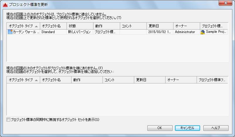 この場合は、非標準のバージョンは、現時点のプロジェクト図面に残り、標準バージョンにより更新されます。次回に図面が同期されると、スタイルまたは表示設定は、古いバージョンまたは非標準のバージョンとして再びリストされます。