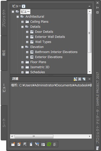 プロジェクト ナビゲータ パレットの[ビュー]タブでは、建物データの個々のビューを作成します。ビューは構成を含み、プロジェクト内の注記、タグ、寸法などの注釈の追加は主にここで行います。ビュー図面を作成したら、図面内にモデル空間ビューを作成できます。