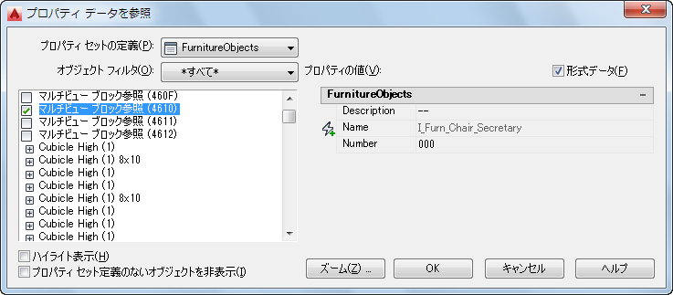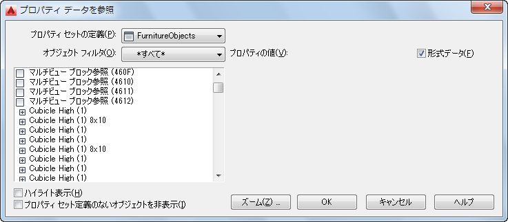 | 選択したプロパティ セット定義がアタッチされているオブジェクトのみを表示するには | [プロパティ セット定義のないオブジェクトを非表示]を選択します。 |