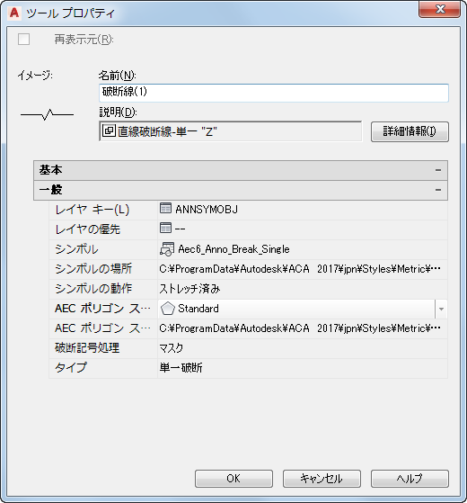 | AEC ポリゴン スタイル | 破断記号にマスク プロパティを持たせるかどうかについて指定します。このプロパティを指定しなかった場合(--)には、スタイルの既定値は、標準スタイルになります。 |