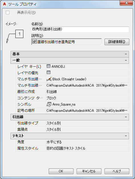 | マルチ引出線スタイル | 注釈のマルチ引出線スタイルを指定します。使用可能なスタイルには、[テキスト]、[ブロック]、[標準]などがあります。 |