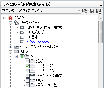 ワークスペースを現在に設定したり、ワークスペースを作成または修正したり、部分 CUIx ファイルからメイン CUIX ファイルにワークスペースを読み込むことができます。