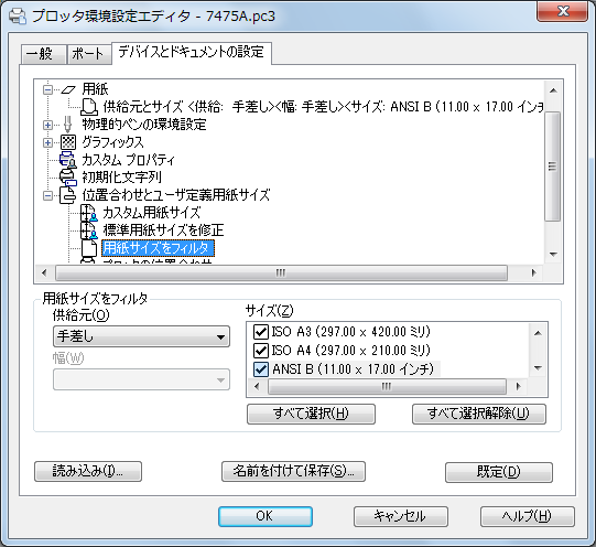 [印刷]および[ページ設定]ダイアログ ボックスで選択した印刷デバイス用に表示された用紙サイズのリストをフィルタします。用紙サイズのリストは、[印刷]ダイアログ ボックスの[印刷設定]タブと、[ページ設定]ダイアログ ボックスの[レイアウト設定]タブに表示されます。