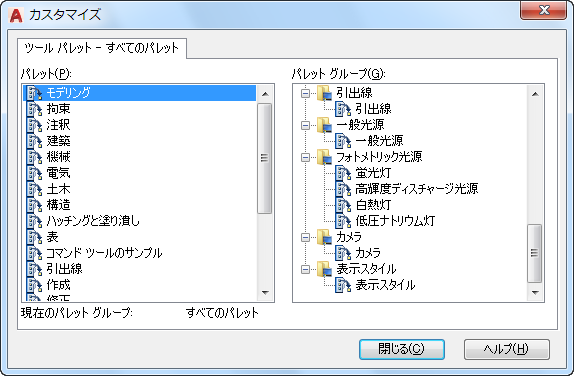 ツール パレット グループとそれぞれに含まれるツール パレットが表示されます。