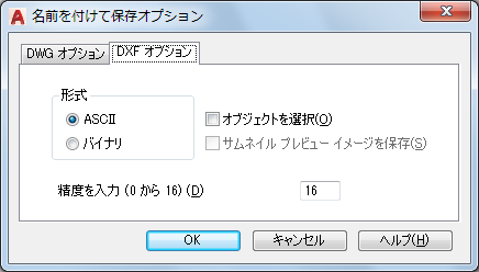 ASCII 形式またはバイナリ形式の DXF ファイルのどちらを作成するかを指定します。ASCII 形式の DXF ファイルはテキスト エディタを使用して読み込むことができ、さまざまなアプリケーションとも互換性があります。バイナリ形式の DXF ファイルは、さらにコンパクトです。ASCII 形式のファイルより、バイナリ形式のファイルを使用した読み書きの処理のほうが高速です。
