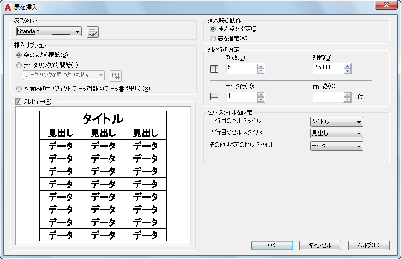 表のサイズと位置を指定します。ポインティング デバイスを使用するか、コマンドのプロンプトに対して座標値を入力します。このオプションを選択した場合、行数、列数、列幅、行高さは、窓のサイズおよび行と列の設定により決まります。