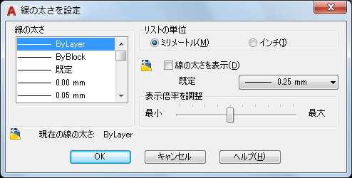 画層の線の太さ[既定]の値をコントロールします。(システム変数 LWDEFAULT)