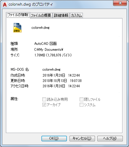 図面ファイルに関する読み込み専用の情報が表示されます。このデータは、オペレーティング システムから取得されます。