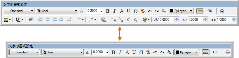 [文字の書式設定]ツールバーの表示をコントロールします。このオプションにより、システム変数 MTEXTTOOLBAR が設定されます。(1 行文字の場合は使用できません)