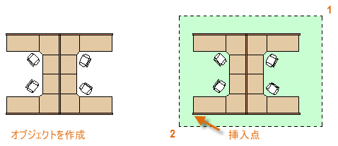ブロックを挿入するとき、ジオメトリは特定の点でカーソルにアタッチされることに注目してください。この場所は、挿入点と呼ばれます。既定では、挿入点は元の図面の原点(0,0)です。